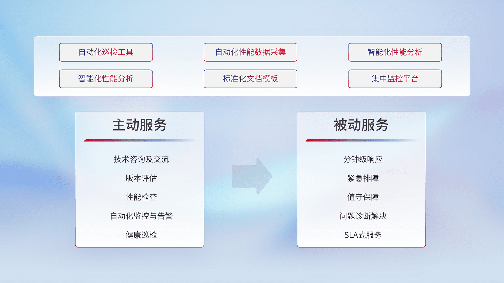 智能化工具和标准化文档,,保障服务质量,,,,提供主动服务(包含技术咨询、、、、版本评估、、性能检查、、、自动化监控与告警、、、、健康巡检)和被动服务包含(分钟级响应、、紧急排障、、、值守保障、、、、问题诊断解决、、、、SLA服务)。。