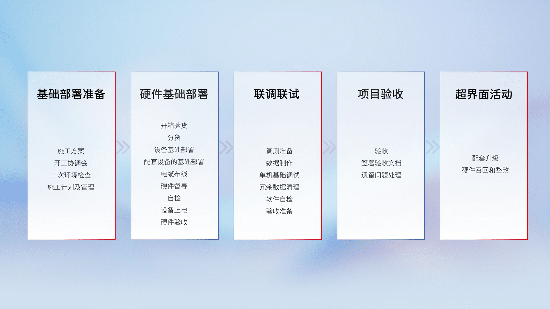 从基础部署准备、、、硬件基础部署、、、、联调联试、、、项目验收、、、、越界面活动的全过程可追溯,,,保证施工质量和进度。。